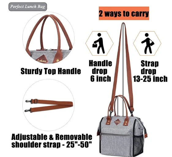 বড় লাঞ্চ ব্যাগে একটি প্রধান বগি রয়েছে (10.5 "x6" x12 "), একটি বড় সামনের জিপার পকেট (8" x7 "x1.5"), একটি পিছনের পকেট (9.5 "x6.5") এবং 2 পাশের জাল পকেট। শীর্ষ হ্যান্ডলগুলি এবং সামঞ্জস্যযোগ্য এবং অপসারণযোগ্য কাঁধের স্ট্র্যাপ (25 "-50") সহজ ক্যারি জন্য ডিজাইন।