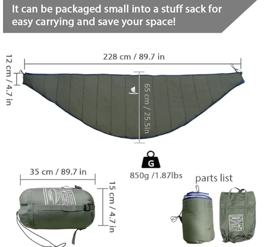 এই হ্যামক কুইল্ট ব্যাকপ্যাকিংয়ের জন্য একটি কমপ্যাক্ট আকারে পরিণত হতে পারে, ক্যাম্পিং, হাইকিং, ভ্রমণের জন্য দুর্দান্ত